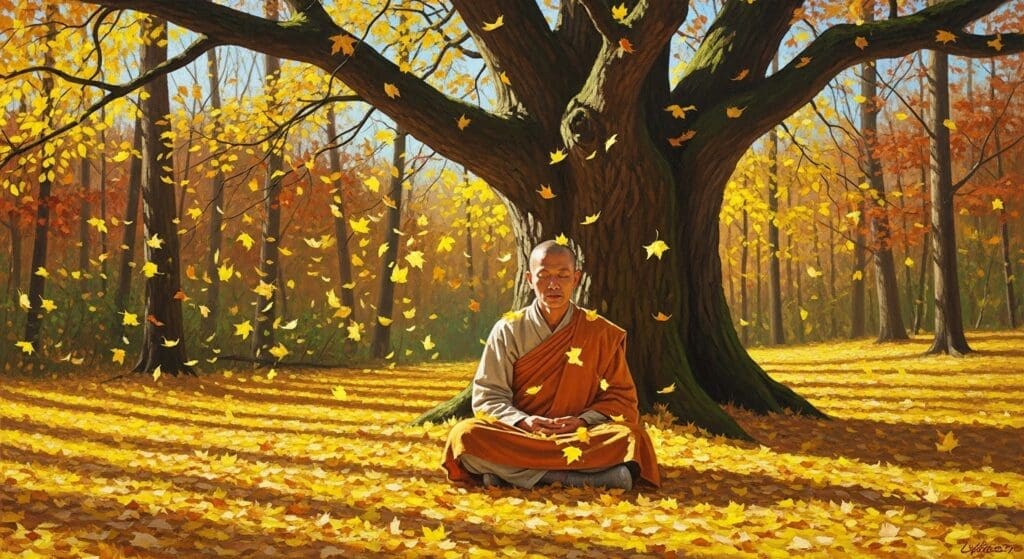 “Phàm sở hữu tướng, giai thị hư vọng.” – Kinh Kim Cang đã nói như vậy. Những gì có hình tướng đều là giả huyễn. Mùa thu là minh chứng sống cho lời dạy ấy. Cái đẹp của nó không nằm ở sắc độ rực rỡ, mà ở chỗ nó đang tan đi. Mỗi chiếc lá vàng là một bài tụng ngắn về Sắc biến thành Không. Khi sắc vàng mất đi, khi hơi ấm rút khỏi cành, khi tiếng gió tắt dần, thế giới rơi vào một khoảng không mênh mông. Nhưng chính trong khoảng không đó, một vẻ đẹp khác xuất hiện – cái đẹp không còn hình dạng, không còn biên giới, không còn thuộc về bất cứ giác quan nào.
