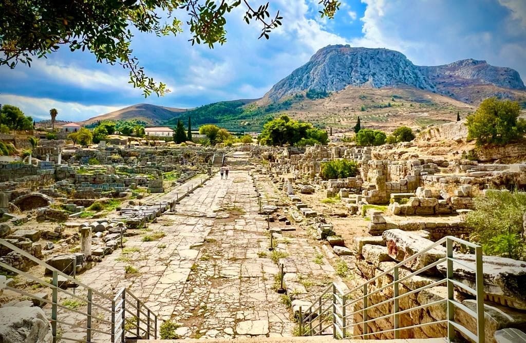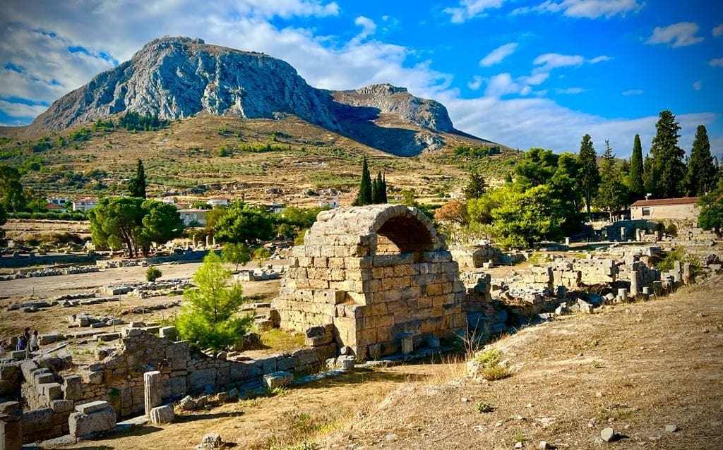 Từ cổ thành, nhìn về hướng Nam, cách khoảng hơn một cây số nhìn thẳng, là ngọn đồi Acrocorinth–575 mét cao–với đồn luỹ xây dựng bằng đá kiên cố, lớn nhất và lâu đời nhất vùng Peloponnese. Trên đỉnh đồi còn nhiều di tích, đền Aphrodite, cả giáo đường Kitô giáo và đền hồi giáo cổ–một di tích lịch sử không thể bỏ qua nếu đã đến Korinthos. Ít ai có khả năng cuốc bộ từ cổ thành lên đến đồi Acrocorinth. Nhìn thấy gần; chỉ đi bộ từ cổng, leo lên đến đỉnh đồi, dốc đá nghiêng, quanh co, rất trơn trợt, đã hụt hơi–hụt hơi thật–không phải vì trời mưa hay đá ướt, nhưng vì hàng mấy ngàn năm, hàng triệu triệu người lên xuống, đá mòn nhẵn nhuội như đánh bóng. Lúc xuống, vẫn phải hết sức thận trọng. Từ trên bốn góc thành–đông, tây, nam, bắc–nơi đỉnh đồi, nhìn xa ra vịnh phía bắc, hay phố Korinthos mới về phía đông, hoặc nhìn xuống bên cạnh chân đồi–phố cổ chỉ là một khu di tích rất nhỏ, khiêm tốn so với quá trình lịch sử tấp nập người người của thời 2000 năm trước, lúc Phaolô đến giảng đạo–thuở ấy, nhà cửa, dân cư có thể lan rộng vài chục cây số về hai hướng đông-tây, vì phía bắc là vịnh, và phía nam là núi cao–chỉ có khoảng đất bằng phẳng kéo dài từ đông sang tây.
