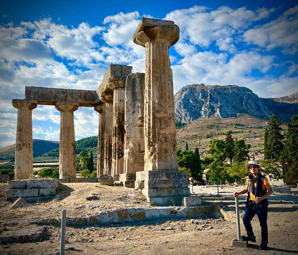 Trái: Corinth được biết nhiều trên thế giới vì [7] trụ cột của đền Apollo còn đứng vững trơ trọi sau mấy ngàn năm, cổng vào phố cổ. Phaolô ắt cũng đã nhiều ngày tháng rao giảng quanh, hoặc ngay trong đền thờ trong suốt 18 tháng ông lưu lại tại đây. Cũng từ đây, Corinth đã in dấu ấn trong tâm thức của Phaolô-thế nên, ông mới viết [2] thư cho giáo đoàn nầy. Phải: Tác giả tại đền thờ Apollo còn sót lại.