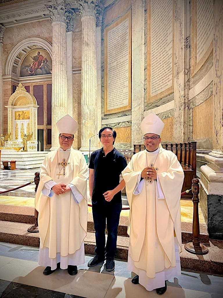 Trái: Tác giả bên tượng thánh Bernard, nơi Phaolô bị giam cầm và tử hình, khoảng năm 64/65. Phải: Tác giả và hai vị giám mục sau thánh lễ tại vương cung thánh đường kinh nhớ Phaolô, bên ngoài thành Roma; một ngôi giáo đường rất nguy nga, thu hút du khách khắp nơi. Nơi đây, điểm dừng của “Hành trình theo dấu chân Phaolô.”