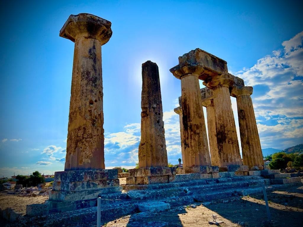 Nổi bật nhất mà mọi người trên thế giới biết về cổ thành Corintho chính là bảy (7) cột đá của đền thờ thần Apollo còn đứng đó. Từ cổng vào, bên phải là một hồ tắm, đục từ một tảng đá—để biết dân Corintho thuở xưa kiên nhẫn, lắm tài và nhiều kỹ năng–chưa nói đến có thừa những huyền thoại, truyền thuyết nghe mê hồn. Nếu không am tường thần thoại Hy-Lạp, thì có hướng dẫn viên hay không, vẫn mù tịt. Vì các thần ông, thần bà, thần nam, thần nữ, ngay cả thần con nít, cũng có những quan hệ, móc nối qua lại chồng chéo. Nên chi, có nghe hướng dẫn viên thao thao bất tuyệt những chuyện ông bà thần họ thuộc lòng từ thuở còn nằm trong nôi, mít ta đây nghe như vịt nghe sấm. Vào bên trong, nhiều gian hàng quán đã đổ nát, chỉ còn những tảng đá chồng lên nhau, cố gắng mường tượng họ chứa được những gì, bao nhiêu–mỗi ngăn cở một căn phòng ngủ.