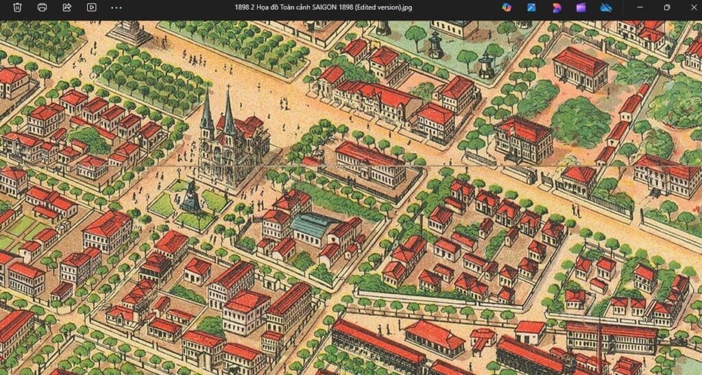Họa đồ 3D năm 1898 đã ghi nhận khuôn viên Bưu điện Sài Gòn (giữa hình, bên phải và chếch xuống dưới nhà thờ Đức Bà) nằm giữa 4 con đường