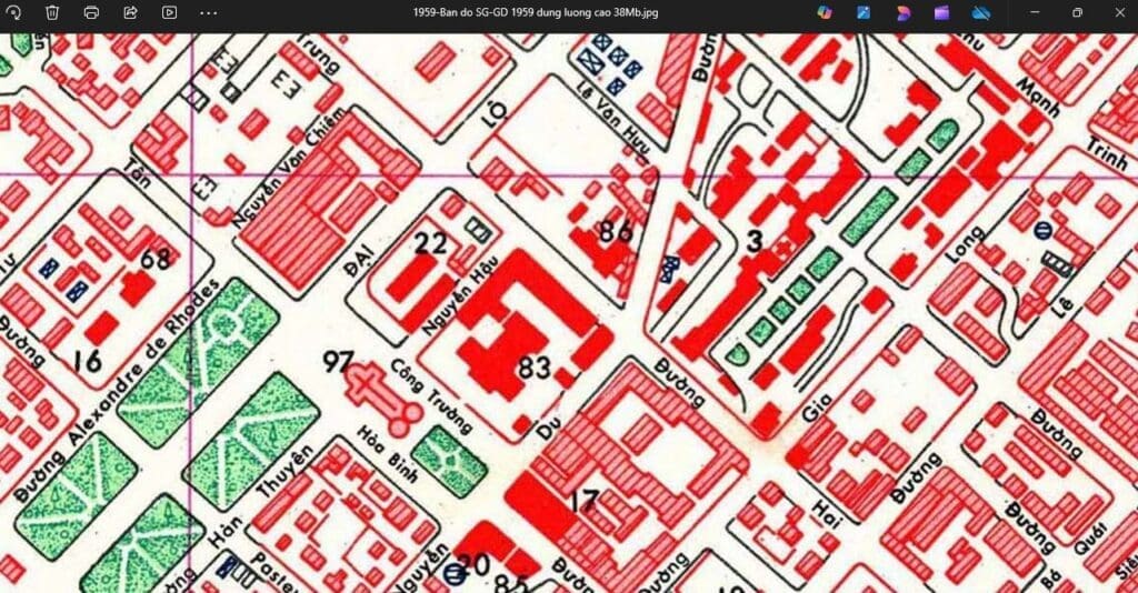 Bản đồ Sài Gòn năm 1968 ghi chú số 83 là Nha Tổng giám đốc Bưu điện gồm cả khối nhà giữa 4 con đường và khối nhà xây năm 1932