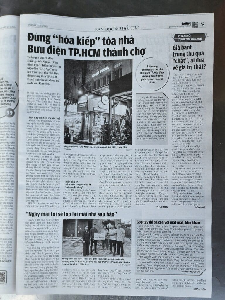 Dư luận phẫn nộ. Nhiều vị am hiểu Sài Gòn xưa, nhà báo lên tiếng. Báo Tuổi Trẻ ngày 4-10-2025 lên một bài nói thẳng của nhà báo, nhà nghiên cứu Sài Gòn xưa Phúc Tiến: “ĐỪNG ‘HÓA KIẾP’ NHÀ BƯU ĐIỆN TPHCM THÀNH CHỢ”. Bài lên Tuổi Trẻ online được vài tiếng thì biến mất (!). May mà báo giấy vẫn còn.