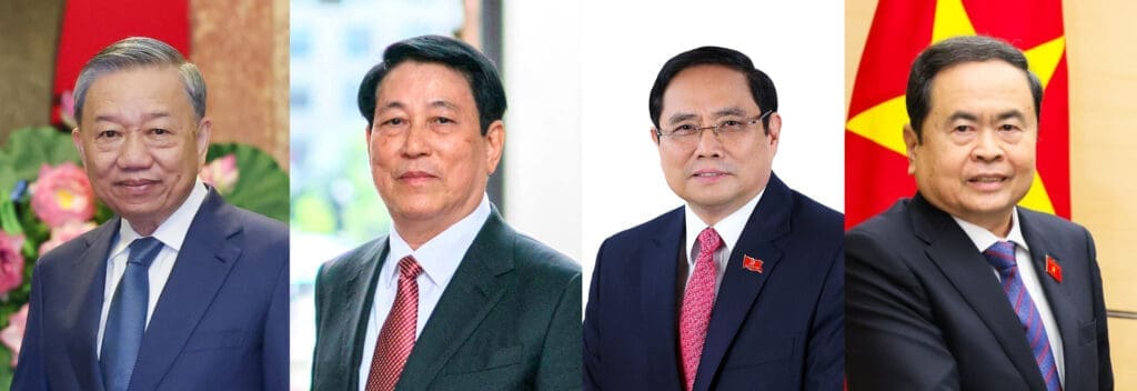 Mô hình tứ trụ lâu nay ở Việt Nam với các nhân vật đương nhiệm: Tổng Bí thư ĐCSVN Tô Lâm, Chủ tịch nước Lương Cường, Thủ tướng Phạm Minh Chính, Chủ tịch Quốc hội Trần Thanh Mẫn. Nguồn: wiki commons.