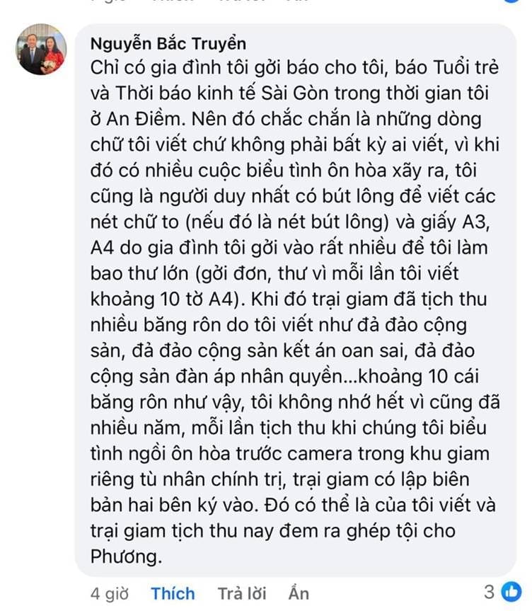 Kèm bài viết là ảnh chụp màn hình comment của TNLT Nguyễn Bắc Truyển, nói mình từng viết các câu biểu ngữ trên giấy A3 và A4, trong đó có câu: