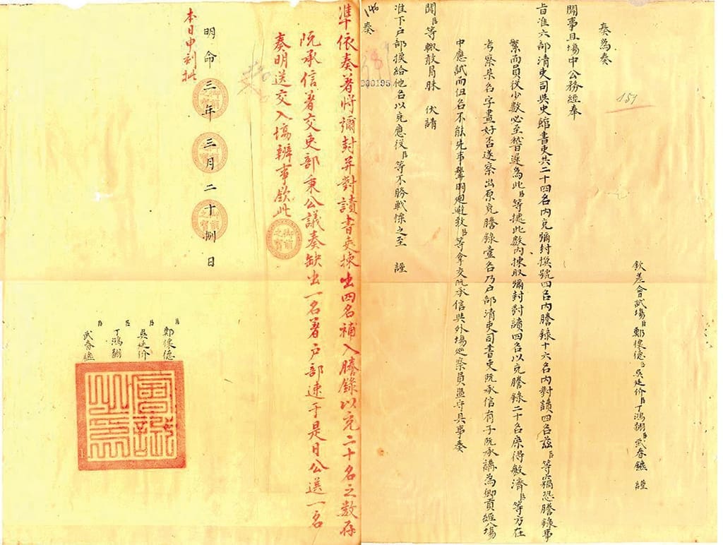 Bản tấu của các quan khâm sai trường thi hội ngày 38.3 năm Minh Mạng thứ 3 về việc bắt thư lại ty Thanh lại, thuộc Bộ Hộ là Nguyễn Thừa Tín có con là Nguyễn Thừa Giảng vào dự thi mà không xin hồi tỵ Ảnh: Trung tâm lưu trữ quốc gia
