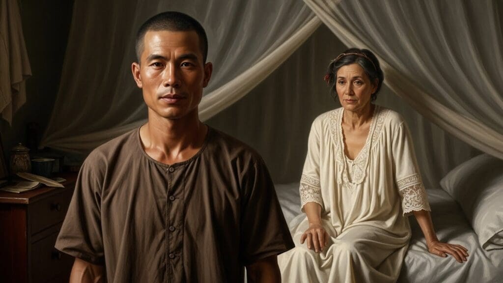Mặt mày chú Năm sượng ngắt. Chú chết đứng, trân trân dõi theo từng động tác của bà Bông. Bà thủng thẳng tới trường kỷ, cầm thau nước và dĩa xà-bông đặt qua ghế, xổ khăn lót lên lớp gỗ đánh vẹc-ni láng lẩy. Rồi bà tới mở tủ, lấy ve dầu dúi vô tay chú Năm, thản nhiên tháo gút cổ áo. Sau vài cái lắc mình, thân thể người đàn bà đã lồ lộ trắng muốt. Thị giác chú Năm Tự tê tê ngờ vực. Thịt da chú bừng lên sinh lực trai tân, rần rật. Bà Bông chẳng nói chẳng rằng, sấp lưng nằm xuống trường kỷ, day mặt vô trong. Chờ một lát, không nghe động tĩnh, bà cất tiếng ngạc nhiên: