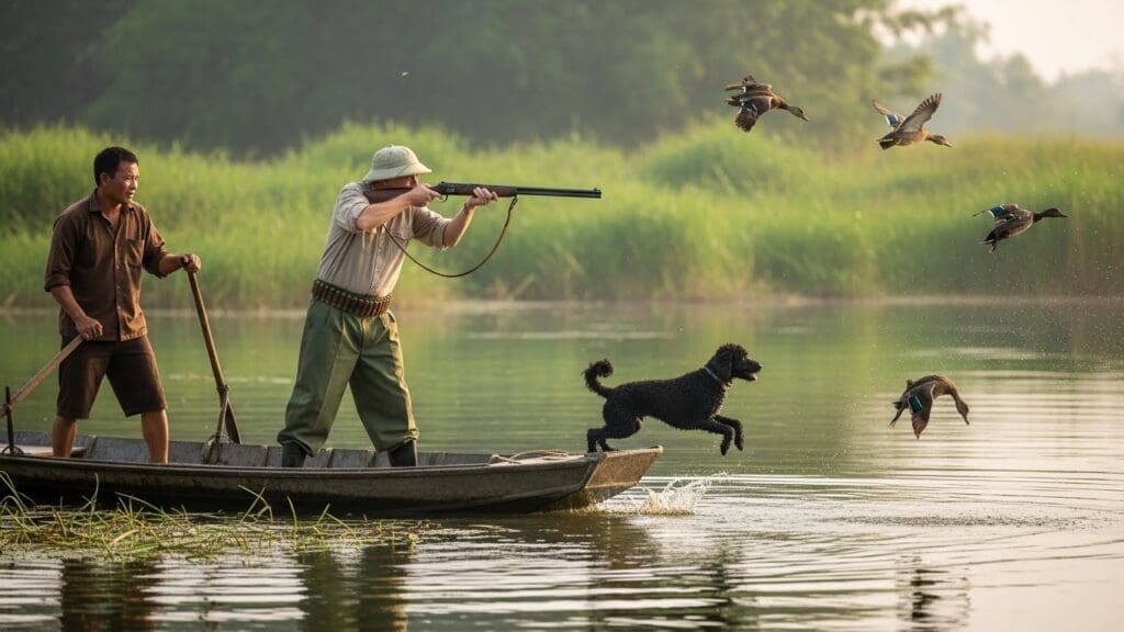 Chó Su phóng xuống nước, quạt chân lủm chủm. Chú Năm Tự xoắn dầm ràn rạt nối đuôi. Lát sau thấy chó Su lội ngược, miệng ngoạm cổ một con vịt tro. Chú Năm Tự chụp lấy, quăng vô lườn ghe, vuốt đầu chó, khen giỏi. Ông Bông nhắm bắn thêm nhiều phát nữa. Chó Su và chú Năm lội, chèo ngang dọc mặt nước loen loét ánh rạng đông rực máu. Ông Bông như say mùi thuốc súng, lắp đạn, lên nòng liên tục cho tới lúc bầy chim trời tản mác thưa dần. Nắng ngày nhú tia tỉa theo viền mặt trời lặng lẽ trồi lên cuối chân mây.