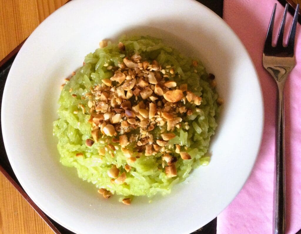 Món xôi vị ở Việt Nam có màu tím sẫm và màu xanh lá dứa trông ngon lành và bắt mắt, vì đôi khi người nấu… chơi ăn gian, rắc thêm vài giọt phẩm màu hóa học lúc ngâm xôi. Còn món xôi vị của tôi có màu phơn phớt như họa phẩm màu nước.