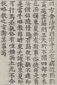 Hán văn: Tây phương thực pháp duy dụng hữu thủ, tất hữu bệnh cố khai thính súc thi, kì trợ tắc Ngũ Thiên sở bất văn, Tứ Bộ diệc vị kiến, nhi độc Đông Hạ cộng hữu tư sự, tục đồ tự thị cựu pháp, tăng lữ tùy tình dụng phủ. Trợ kí bất thính bất già, tức thị đương hồ Lược Giáo. Thì chúng vô ki nghị, Đông Hạ tức khả hành yên; nhược chấp tục hữu xi hiềm, tây thổ nguyên bất hợp tróc. Lược Giáo chi chỉ, tư kì sự yên.
