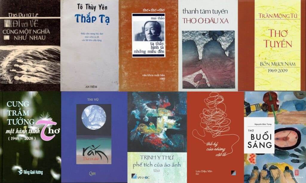 Bên cạnh các tên tuổi lớn từ miền Nam như Nguyên Sa, Thanh Tâm Tuyền, Cung Trầm Tưởng, Tô Thùy Yên, Trần Dạ Từ, Minh Đức Hoài Trinh, Nhã Ca, Viên Linh, những người bắt đầu làm thơ từ sau 1975 và một số viết từ trước 1975 nhưng vẫn tiếp tục sau đó, đã tạo ra khuôn mặt của thơ hải ngoại: Du Tử Lê, Cao Tần, Mai Trung Tĩnh, Thanh Nam, Đỗ Quý Toàn, Nh. Tay Ngàn, Mai Thảo, Nguyễn Đăng Thường, Trần Mộng Tú, Cao Đông Khánh, Luân Hoán, Viên Linh, Đỗ Kh,. Khế Iêm, Thi Vũ, Lê Thị Huệ, Thường Quán, Huy Tưởng, Nguyễn Xuân Thiệp, Trịnh Y Thư, Nguyễn Thị Thanh Bình, Nguyễn Hoàng Nam, Vũ Hoàng Thư, Đỗ Quyên, Nguyễn Thị Hoàng Bắc, Nguyễn Thị Thanh Bình, Tôn Nữ Thu Dung, Phạm Cao Hoàng, Lữ Quỳnh, Trần Trung Đạo, Lê Đình Nhất Lang, Đinh Linh, Vương Ngọc Minh, Vũ Quỳnh Hương, Nguyễn Hàn Chung, Lâm Quang Mỹ, Thế Dũng, Đỗ Lê Anh Đào, Lưu Diệu Vân, Bắc Phong, Uyên Nguyên, Nguyễn Linh Quang, Phan Ni Tấn, Đức Phổ, Nguyễn Đức Bạt Ngàn, Trần Thị Nguyệt Mai, Vi Lãng, Đặng Thơ Thơ, Nguyễn Thị Ngọc Lan, Thận Nhiên, Đinh Trường Chinh, Phan Huyền Thư, Trần Hạ Vi, Bùi Mai Hạnh, Võ Thị Như Mai, Phan Tấn Hải, Nguyễn Thanh Châu, Như Quỳnh de Prelle, Pháp Hoan, Đỗ Quang Nghĩa, Nam Dao, Nguyễn Đức Tùng. Danh sách không đầy đủ, còn dài hơn thế.