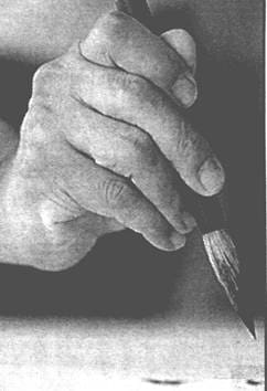 Quản bút phải cầm sao cho thẳng, ngón cái và ngón trỏ cầm cán, bút đè vào đốt ngón tay ngoài cùng của hai ngón trỏ và giữa. Các ngón tay khum khum làm sao để có thể để được một quả trứng trong lòng bàn tay. Tay cầm bút phải chặt và thầy giáo thường thử bằng cách bất ngờ giựt thử khi học trò sơ ý xem có tuột khỏi tay không.