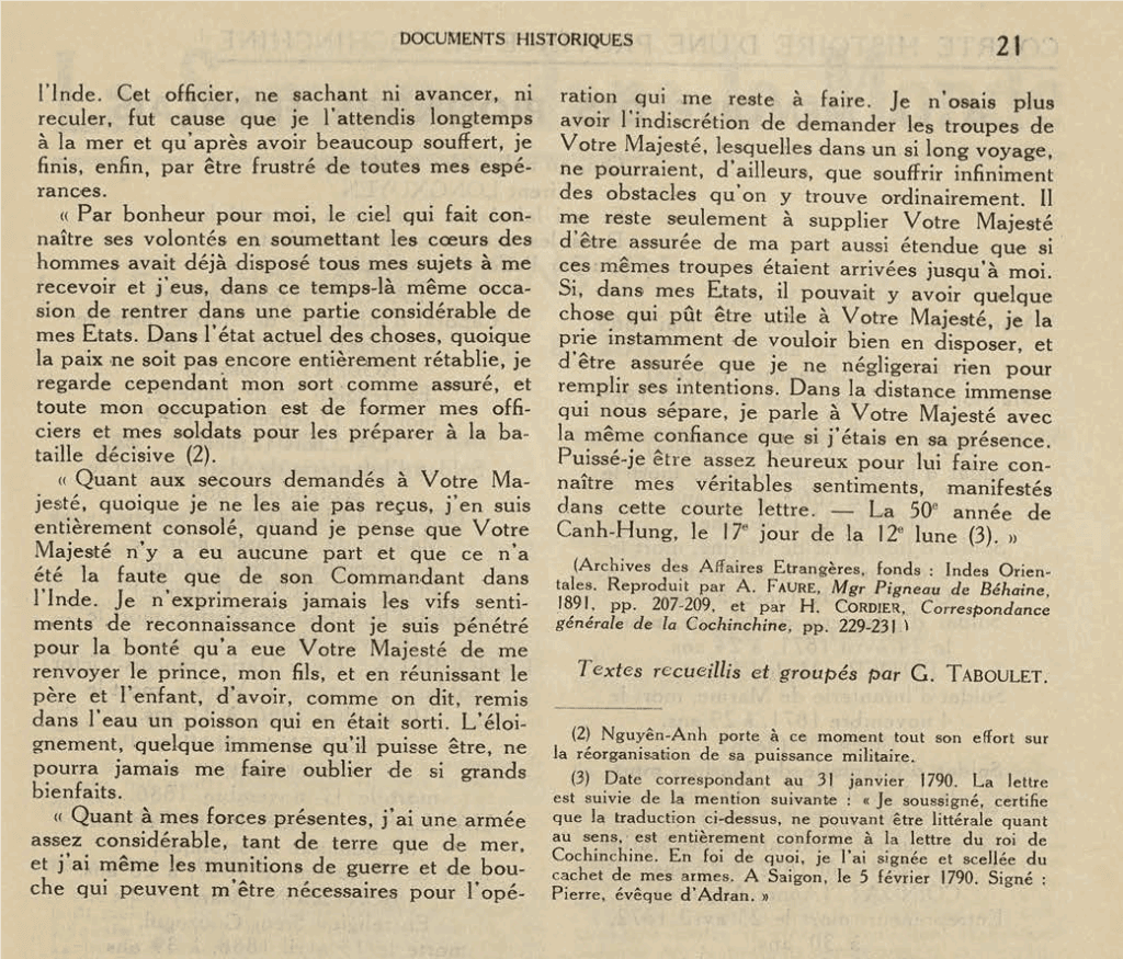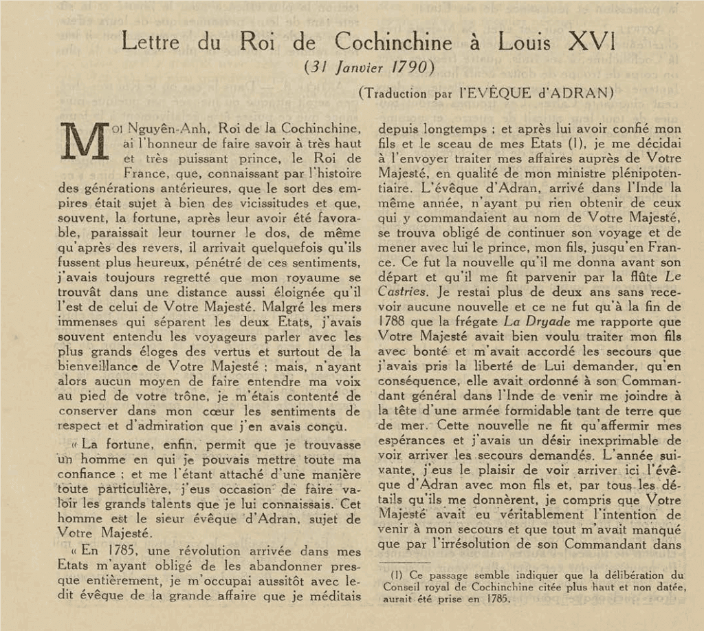 Trong số báo Indochine số 93 xuất bản ngày Thứ Năm 11 tháng Juin, 1942 để kỷ niệm huý nhật của vua Gia Long (15 Juin, 1942) có đăng tải một bức thư của chúa Nguyễn Phúc Ánh gửi cho Pháp hoàng Louis XVI đề ngày 31 Janvier 1790 (hình trên). Đây là bản dịch một bức thư chúa Nguyễn viết cho vua Pháp Louis XVI để cảm ơn ông (dù không thi hành) về một hiệp ước tương trợ do giám mục Bá Đa Lộc thay mặt vua nước An Nam ký với nước Đại Tây (tức nước Pháp). Bức thư chữ Hán của chúa Nguyễn được giám mục xứ Adran dịch sang tiếng Pháp để kèm theo bản chính và Bá Đa Lộc có phụ chú bảo đảm rằng bản dịch trung thực với ý nghĩa của nguyên tác (cước chú 3).