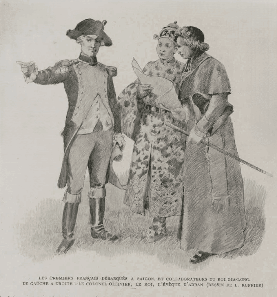 Cuối năm 1784, trong khi đang bôn đào ở vùng biển vịnh Xiêm La, chúa Nguyễn Phúc Ánh đã đem quốc ấn và người con trai đầu mới bốn tuổi gửi cho giám mục xứ Adran (tên Hán Việt dịch là Bá Đa Lộc) để đi thuyền sang khu vực Ấn Độ thuộc Pháp tìm kiếm sự trợ giúp quân sự ngõ hầu khôi phục lại Nam Hà nay đang trong tay của Tây Sơn. Đến Pondichéry tháng 2-1785, giám mục Bá Đa Lộc đã thương thuyết với viên tổng trấn tại đó nhưng không thành công. Ông phải tiếp tục sang thẳng Âu châu để trực tiếp nói chuyện với Pháp hoàng và kết quả là vua Louis XVI đã bằng lòng ký kết một hiệp ước cung cấp cho chúa Nguyễn 4 tàu chiến và 1400 quân, giao cho bá tước De Conway, người chỉ huy cao cấp nhất của các thuộc địa Pháp tại Ấn Độ thi hành.