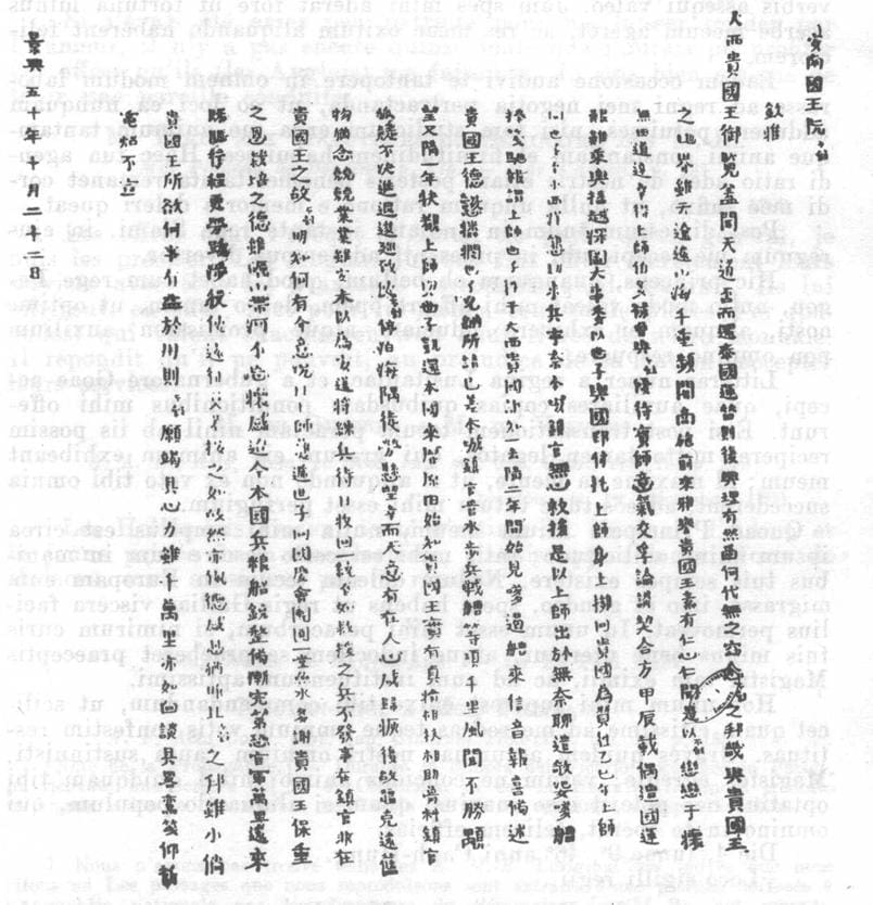 貴國然知一去隔二年間始見嗲遏艚來信音報喜揭述貴國王德懿⑫⑬⑭也。兒所已差本城鎮官管水步兵戰艚等項千里風聞不勝顒望。