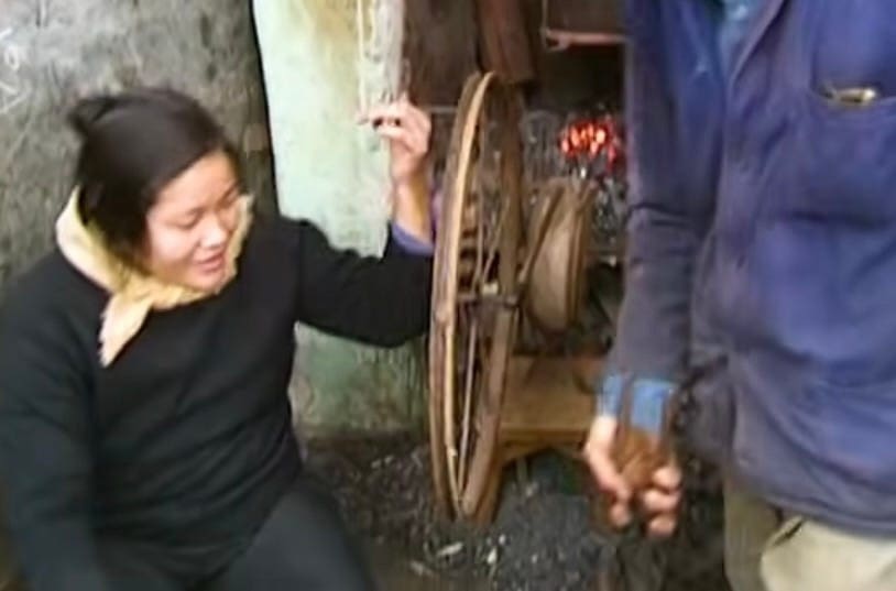 Bên trong một con ngõ hẹp, tường vôi xám loang lổ muội than, có một lò rèn còn sáng lửa. Người đàn ông mặc áo bảo hộ xanh đã sờn, tay cầm kìm sắt, mặt đỏ lên vì hơi nóng. Cạnh ông, một người phụ nữ ngồi trên ghế gỗ thấp, cổ quàng khăn vàng, tay giữ lấy một thanh sắt vừa nung đỏ. Phía sau họ, ngọn lửa trong lò phả ra hơi đỏ, hắt bóng hai người lên bức tường.