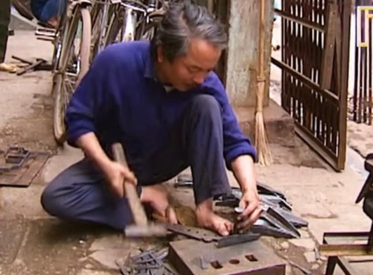 Cảnh này chính là một phân đoạn khác của buổi sáng Hà Nội 1990 — một người thợ trung niên ngồi ngay trên vỉa hè, tay cầm búa, chân trần, giữa những mảnh sắt và khung cửa. Một hình ảnh mà ống kính nước ngoài chỉ ghi lại thoáng qua, nhưng lại nói hết cả một giai đoạn: thời kỳ Đổi Mới vừa mở cửa, nhưng người dân vẫn còn phải tự chế tạo lấy mọi thứ.