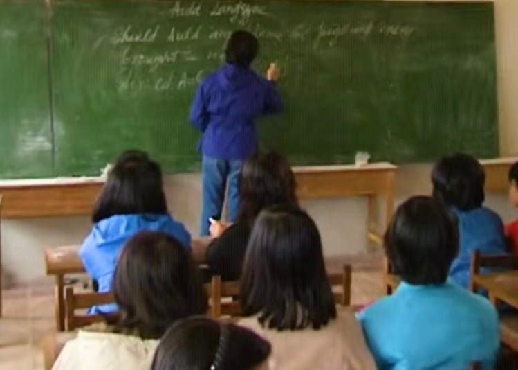 Căn phòng học nhỏ, tường loang lổ vôi, một bảng đen cũ chiếm gần nửa bức tường. Dòng chữ phấn trắng viết nguệch ngoạc: “Should – would – could…”