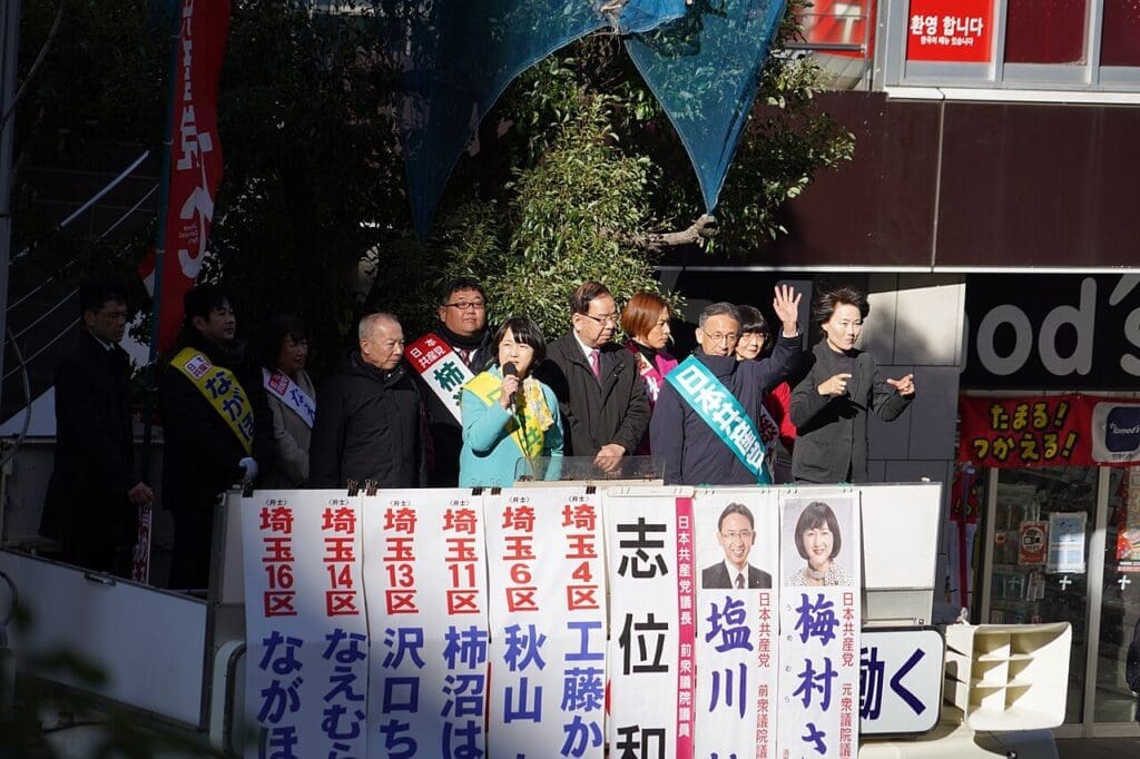 Từ trái sang phải: Các chính trị gia JCP đang phát biểu trên đường phố trước Ga Omiya; Các chính trị gia của Liên minh Cải cách Trung dung; Áp phích tranh cử ở ở Shibuya, Tokyo