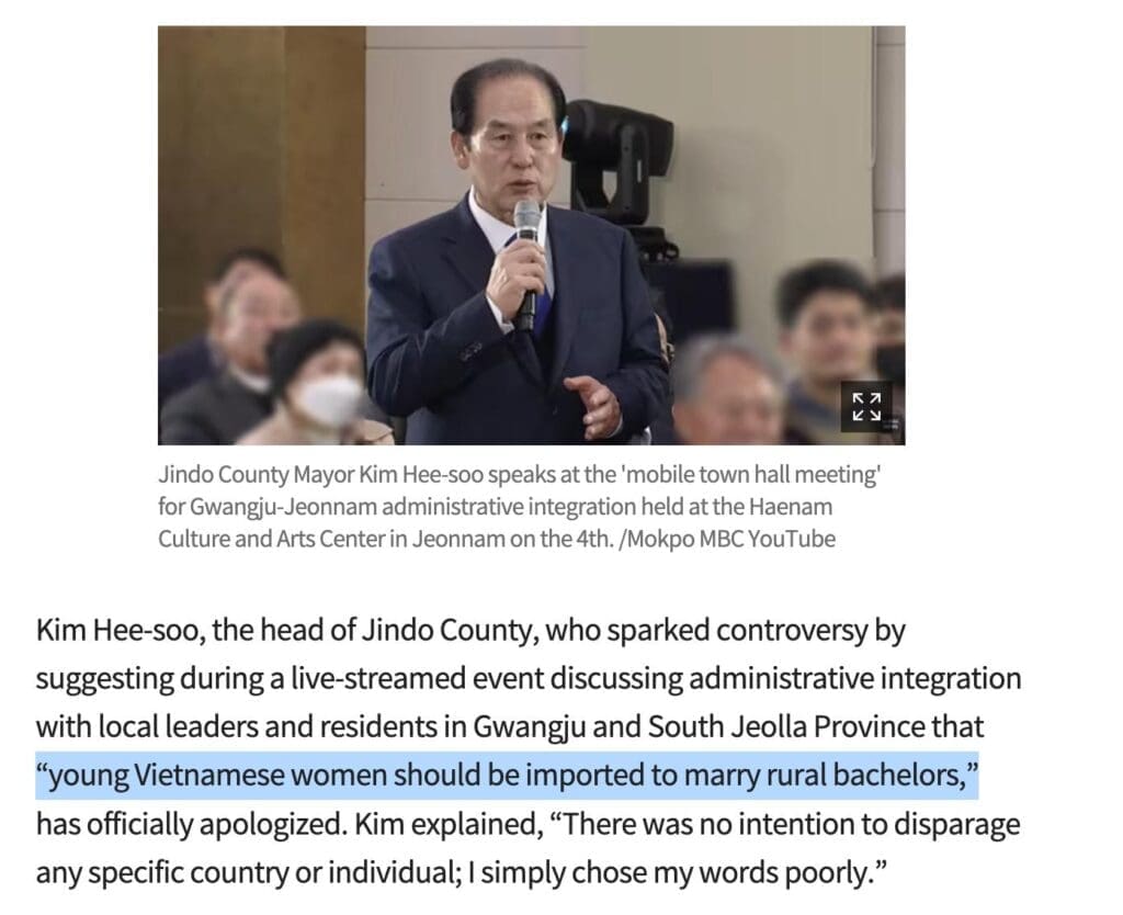 [1] Ông Kim Hee-soo, Thị trưởng quận Jindo bên Nam Hàn, nói rằng: “young Vietnamese women should be imported to marry rural bachelors” (“Nên nhập cảng phụ nữ Việt Nam trẻ để kết hôn với những đàn ông độc thân ở nông thôn”).