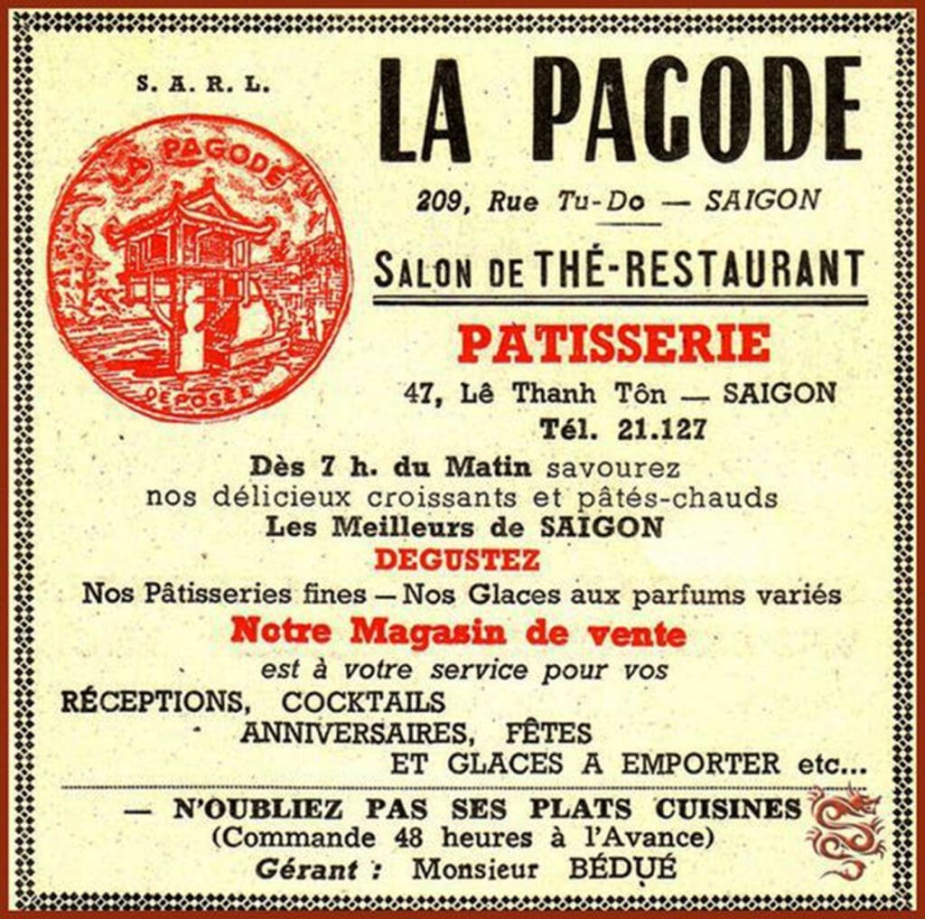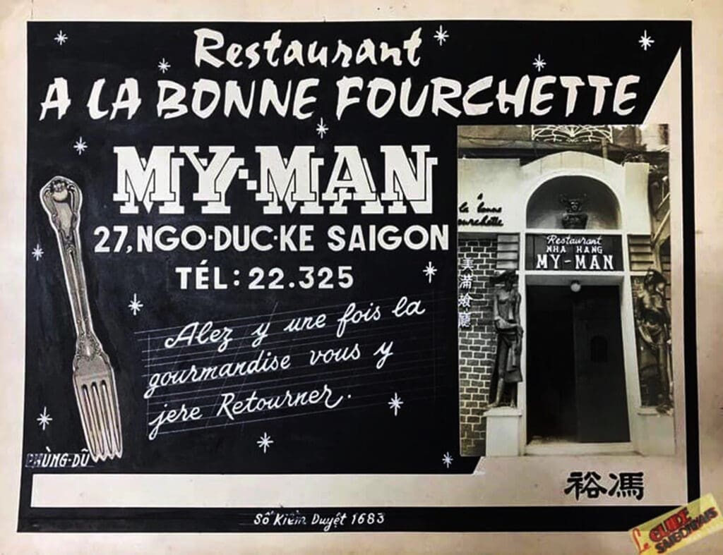 Các quán Bẩy Hổ đường Cao Thắng, Bình Lợi Quán nằm giữa Sài Gòn và Thủ Đức, Chả Cá Thăng Long số 20 Phan Thanh Giản (nay là Điện Biên Phủ), Như Ý số 59 – 61 Thủ Khoa Huân, Nguyễn Văn Đắc số 5-7 Tạ Thu Thâu, Con Gà Quay ở Thủ Đức, Trúc Lâm Trà Thất số 118 Ngô Tùng Châu (nay là Lê Thị Riêng), với đặc sản Việt như chả cá thịt dê và biểu diễn âm nhạc cổ điển Việt Nam, Vân Cảnh số 184 Calmette. Nhà hàng Cơm chay có nhà hàng Tín Nghĩa số 9 Galiéni, Vạn Lộc số 165 rue Colonel Boudonnet (nay là Lê Lai) …