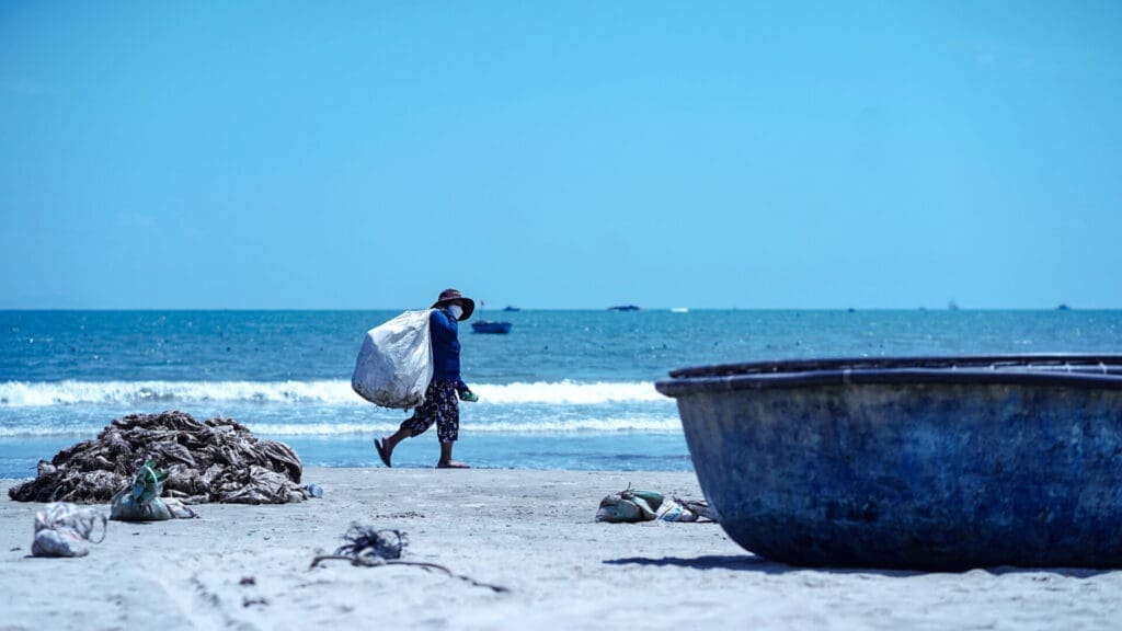 (Hình: Một bạn nhặt rác ở Đà Nẵng, nơi các bãi biển và đường thủy ngập tràn rác thải nhựa) (1)
