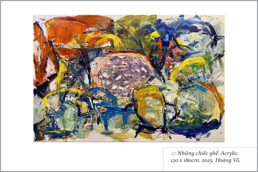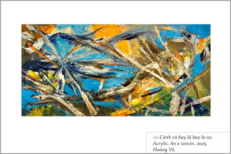 Sinh ra và lớn lên ở vùng đất Long An, tuổi thơ của Hoàng Võ thấm đẫm sắc nắng gió và phù sa miền sông nước Mê Kông. Trong tranh anh, những mảng màu mạnh, tiết tấu phóng khoáng, đường nét dứt khoát gợi cảm giác chuyển động liên tục – như tiếng vọng của những mùa nước nổi, của nhịp sống dân dã mà mãnh liệt. Nguồn năng lượng Nam Bộ ấy được anh chắt lọc qua lối tạo hình mang tính trừu tượng biểu cảm, đôi khi dữ dội, đôi khi lắng sâu, nhưng luôn ẩn chứa sức sống nguyên sơ của thiên nhiên và con người phương Nam.