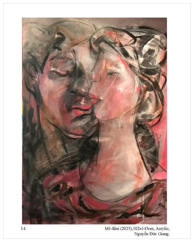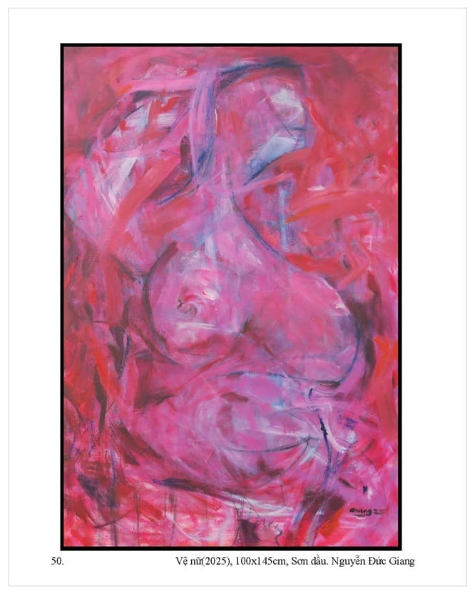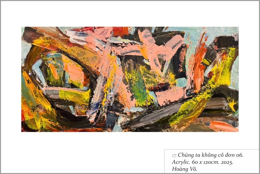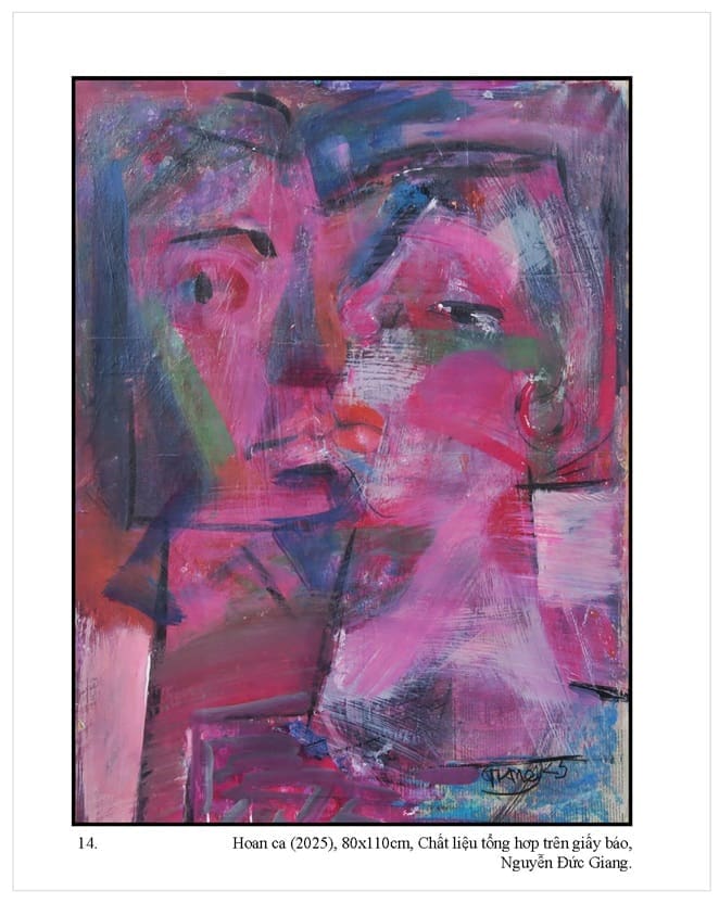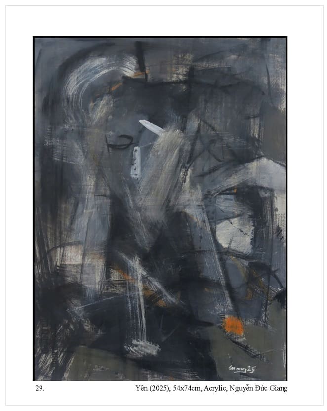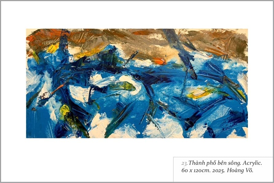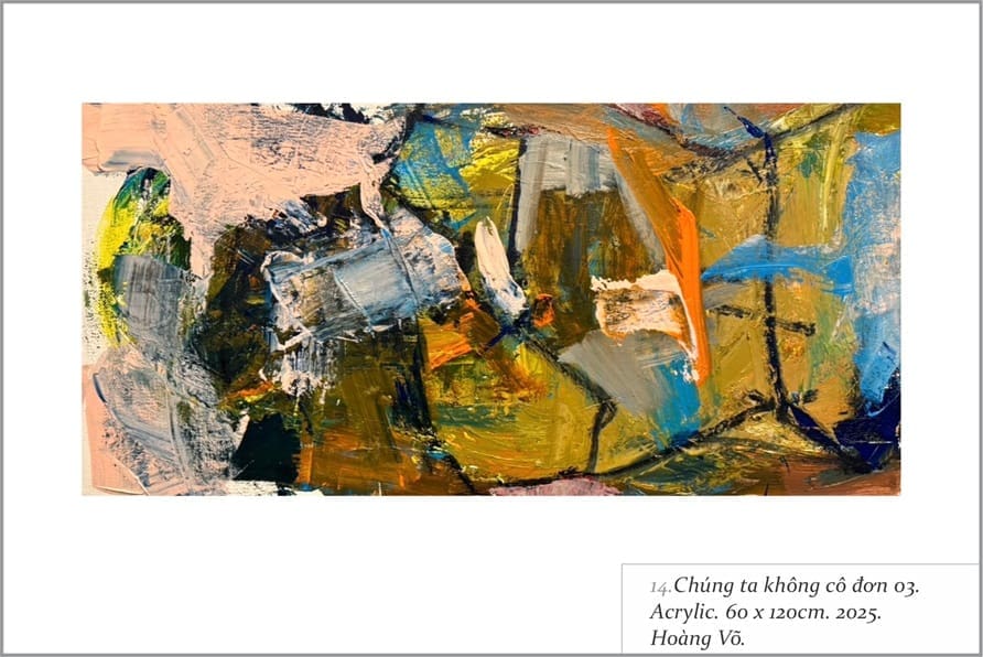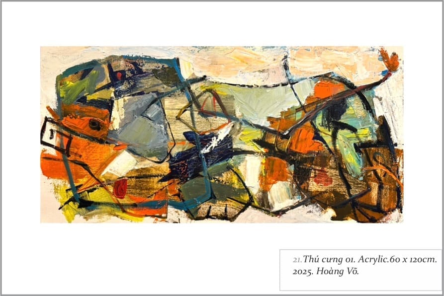 Tranh của Hoàng Võ (Giảng viên Khoa Mỹ thuật Trường ĐH Kiến trúc Tp.HCM) như những nhịp điệu mạnh, phóng khoáng, mang hơi thở của đất trời phương Nam; còn tranh của Đức Giang lại sâu nội cảm, ánh lên từ những mảng tối – sáng mơ hồ, gợi ký ức miền Bắc thẳm sâu.