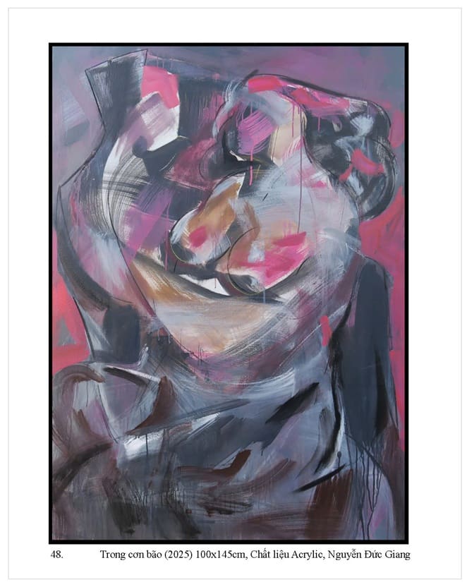 Trái lại, Đức Giang (Giảng viên khoa đồ hoạ trường ĐH Văn Lang TP.HCM) – người con của Hà Nội – lại mang theo trong mình lớp phù sa trầm mặc của sông Hồng. Bảng màu của anh thường nghiêng về gam trầm, những nâu sòng, tím than, xám tro… được xử lý với nhịp điệu nhẹ, sâu và thấm. Tranh Đức Giang gợi liên tưởng đến chất men gốm cổ, đến ký ức và những lớp hoài niệm văn hóa miền Bắc. Hình tượng trong tranh anh không ồn ào mà ẩn chứa một nỗi lặng sâu, có lúc là dung nhan con người, có khi là biểu hiện của cảm xúc – một thứ hiện thực được khúc xạ qua cảm quan tâm linh.