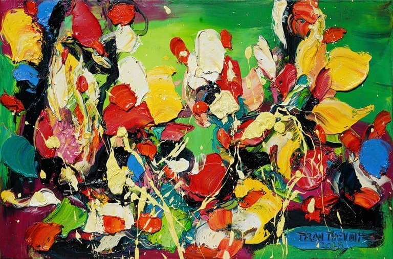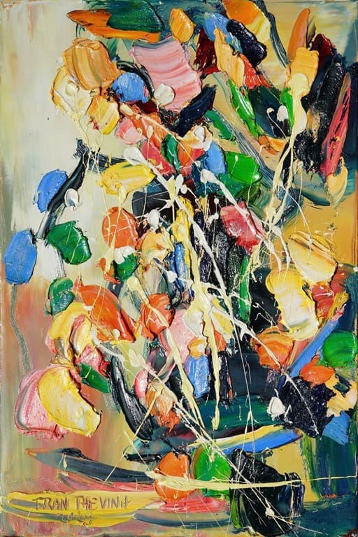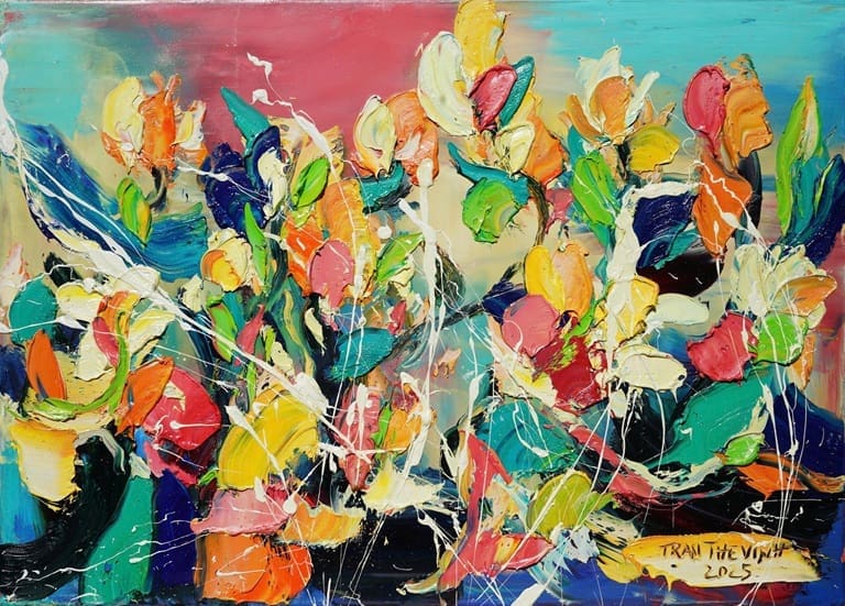 “Vũ điệu ngàn hoa” vì thế không chỉ là tên gọi của một triển lãm, mà còn là một trải nghiệm thị giác và tâm hồn. Người xem không còn đứng ngoài ngắm, mà như bị cuốn vào nhịp vũ điệu bất tận – nơi cái đẹp không hiền lành, mà luôn ở trạng thái căng tràn, muốn bùng nổ. Trần Thế Vĩnh không vẽ hoa như một đối tượng để ngắm nhìn. Anh để cho hoa “nổ tung” ra thành nhịp điệu, thành những mảng màu và vệt cọ. Ở đó, ta thấy những đốm đỏ, vàng, cam rực như lửa cháy; xanh, tím đằm lại như bóng rừng sâu. Tất cả xoắn xuýt, xô đẩy, hòa tan nhau thành một vũ điệu ngàn hoa – thứ vũ điệu vừa hỗn loạn, vừa ngập tràn sức sống.