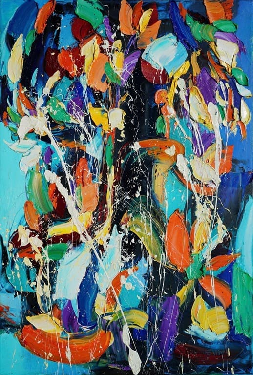 Tranh của Vĩnh không phải kiểu vẽ hoa cho người ta nhận diện từng cánh, từng nhụy. Vĩnh “xé” hoa ra thành màu, thành mảng, thành những cú quăng cọ tóe lửa. Đỏ, cam, vàng thì bùng nổ như lửa cháy. Xanh, tím thì rủ xuống như bóng rừng mưa. Đứng trước tranh, nhiều khi không biết là hoa gì, nhưng lại nghe rần rật trong người cái nhịp điệu – như có dàn nhạc vô hình đang chơi bản “valse ngàn hoa”.