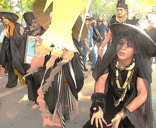 Hình 5: Một nhóm kịch biểu diễn “Vũ điệu Tử thần” để tưởng niệm con sông Kok. [Nguồn: photo by Tom Fawthrop].