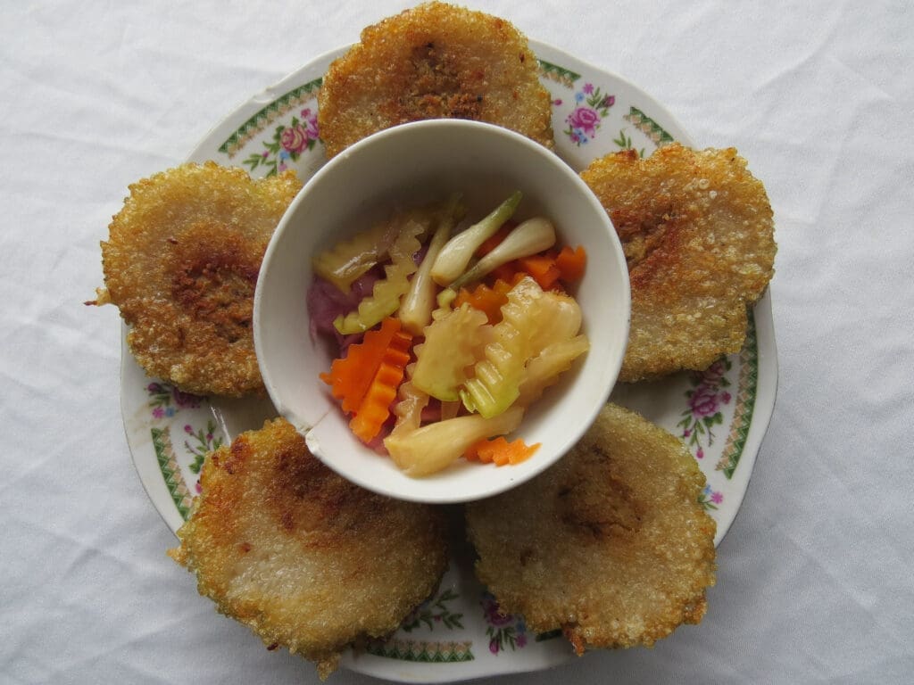Bánh tét chiên ăn cùng dưa món. Photo: Báo Tuổi Trẻ