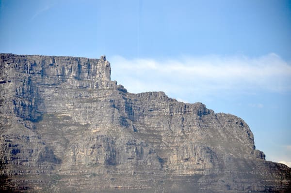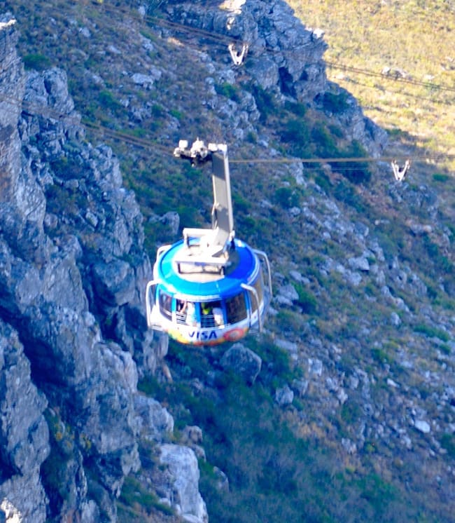 Nhưng V&A Waterfront là do con người xây dựng, còn Table Mountain, Lion Head và Signal Hill mới chính là những thắng cảnh thiên nhiên mà tạo hóa đã ban cho Cape Town. Ai đã đến thành phố này mà chưa lên đỉnh của núi Table thì xem như 70% chưa biết gì về vẻ đẹp thiên nhiên của Cape Town. Có đứng trên đỉnh Table Mountain (vào ngày nắng đẹp trời) người ta mới thấy được cái không gian đẹp tuyệt vời của Cape Town, không thể diễn tả bằng ngôn ngữ được. Cái tên Table Mountain có nghĩa là núi Bàn vì hình dáng núi giống hệt như “cái bàn” hiện giữa không gian, sau lưng thành phố. Núi cao hơn 1,000m, du khách có thể đi xe đến trạm Cableway và từ đây lấy cableway lên trên đỉnh Table Mountain, hành trình chỉ mất chừng 4 phút, nhưng thời gian chờ cableway thì không luờng trước được, tùy theo số lượng người đứng xếp hàng. Giá cho chuyến khứ hồi bằng cableway khá đắt khoảng $US25.00 một người (nghe nói giá sẽ cao hơn nữa). Cableway được thiết kế cũng rất đặc biệt, khác hẳn những cable-car mà tôi có dịp đi qua. Cabin của cableway có thể chứa đến khoảng 50 người, trong lúc được kéo lên đỉnh thì cableway tự quay vòng tròn để mọi người trong cabin có thể thưởng ngoạn hết các thắng cảnh dưới chân. Đứng trên đỉnh Table Mountain du khách không những chỉ thưởng ngoạn cảnh đẹp của Table Bay và thành phố Cape Town mà người ta còn có thể nhìn xa hơn, suốt đến tận cuối cực nam Cape of Good Hope nơi đất liền giáp với biển Atlantic.