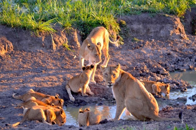 Tuy nhiên, cuộc hành trình không phải bao giờ cũng trơn tru phẳng lặng để cho mọi người có nhiều cơ hội may mắn như nhau. Có người đã đến các safari năm bảy lần mà vẫn chưa có duyên để gặp đủ “Big 5”. Có thể vì thời tiết mưa nắng, có thể vì chuyện “gia đình bất ổn” của các loài thú này. Thí dụ chẳng hạn như hôm đó gia đình Sư tử, “chàng và nàng” gầm gừ vừa choảng nhau xong nên chàng nhất định không chui ra khỏi hang để đi gặp mọi người. Tôi may mắn gặp được một “Gia đình sư tử” trong giây phút đó là một “gia đình êm ấm”. Hình ảnh mà tôi chụp được cho thấy chàng sư tử này có tinh thần rất “gia trưởng” bên các nàng sư tử thê thiếp. Chàng dáng rất oai phong, nằm bệ vệ yên lặng gần bên vũng nước, mắt mơ màng nhìn trời nhìn đất để mặc các nàng sư tử cái lững thững tự động đưa các chú sư tử con đi đến quay quần bên chỗ chàng nằm. Các bà mẹ luôn đùa chơi với đám con, không dám làm phiền đến “phu quân” của các nàng. Các chú sư tử con cũng thế, đùa giỡn với nhau nhưng không một tên nào dám bén mảng đến giỡn mặt với ông bố.