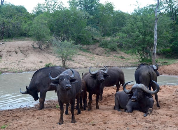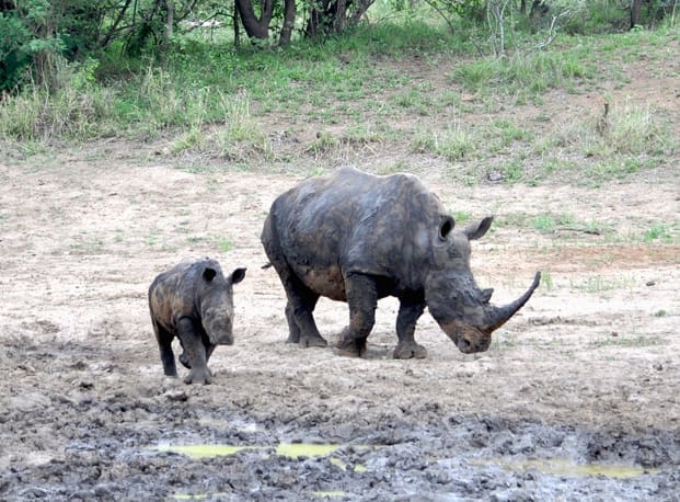 Tê Giác (Rhinoceros) và African Buffalos là hai loại thú khác được xếp vào “big 5” của Phi Châu và hai loại này đều có thể thấy ở Kruger National Park. Trong hành trình safari buổi chiều, trời đã nhá nhem tối, tôi bắt gặp hình ảnh hai mẹ con Tê-giác đang hạnh phúc ăn cỏ và lững thững đi bên nhau, chúng mải ăn mà không thèm biết đến mọi chuyện chung quanh, có lẽ chúng đã quá quen với các xe ranger Safari chạy gần đến chúng. Trước đó tôi cũng đã bắt gặp một con tê-giác khác trong rừng, loại black Rhino, nhưng khi thấy tiếng động tê-giác đã vội bỏ đi. Tê giác cũng chia làm hai loại: black Rhinocero và white Rhinocero, loại “black” có vẻ hung tợn hơn loại “white”. Tuy trông dáng nó có vẻ to lớn phục phịch nhưng khi chạy chúng cũng có thể đạt đến tốc độ 55km/h. Bạn có tin chắc bạn chạy nhanh hơn nó chăng!