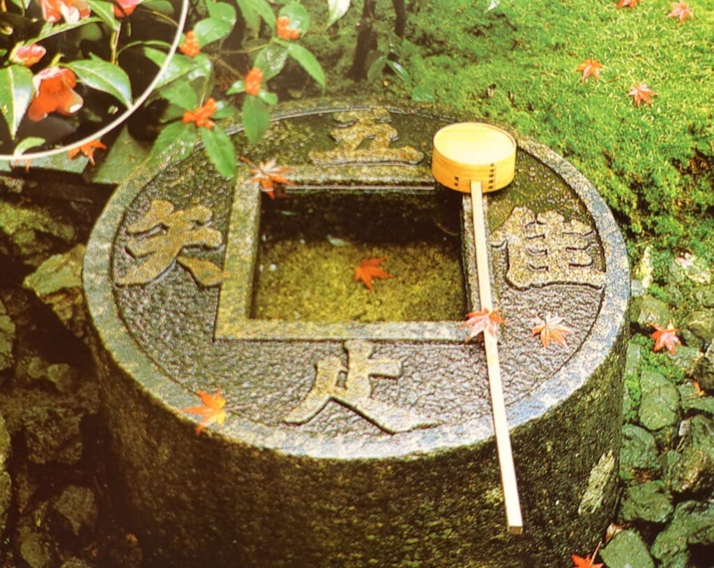 Rời ngôi vườn thiền đá, đi về phía đông của chánh điện, bạn gặp một tảng đá tròn không to lắm, có một dòng nước trong vắt chảy qua. Đây là nơi tu sinh thường lấy nước nấu trà hay tín đồ rửa tay xúc miệng trước khi ngồi quán chiếu toạ thiền. Nhưng điểm đặc biệt, trên mặt đá của tảng đá tròn có đục đẽo một hình vuông ở giữa. Hình vuông này chính là chữ “Khẩu” trong Hán Tự. Mito Mitsukuni, người của thế kỷ 16 đã tìm cách chơi “Hán tự”, ông đã cho chữ “khẩu” cộng vào bốn chữ chưa hoàn thành khác (chung quanh chữ Khẩu) để tạo thành bốn chữ “Ngô (Tôi, Ta), Duy, Túc, Tri / tiếng Nhật là Ware – Tada – Taru – Shiru”, ý nghĩa nói lên sự “chỉ có Tôi biết đủ là đủ”. Mitsukuni cho rằng đây là một yếu tố tạo thành sự thanh thản cho đời sống con người. ý nghĩa này luôn nhắc nhở các tu sinh mỗi khi lấy nước pha trà, rửa tay hay xúc miệng.