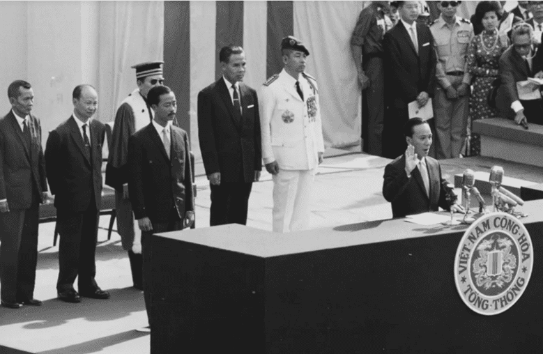 Ông Nguyễn Văn Thiệu tuyên thệ nhậm chức tổng thống Đệ nhị Việt Nam Cộng hòa. Phía sau ông là Phó Tổng thống Nguyễn Cao Kỳ, Tổng Tham mưu trưởng Cao Văn Viên. Ảnh: U.S. Information Agency 67-0480.