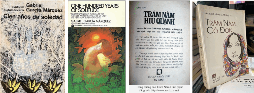 “Trăm Năm Hiu Quạnh,” từ trái, bìa của nguyên tác tiếng Tây Ban Nha ấn bản đầu tiên; bản dịch tiếng Anh của dịch giả Gregory Rabass được ca ngợi rộng rãi vì đã nắm bắt được chất thơ và siêu thực trong tác phẩm của Gabriel García Márquez; mẫu quảng cáo bản dịch tiếng Việt trước năm 1975; và bản dịch tiếng Việt năm 2003.