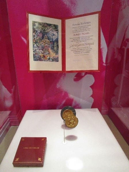Tác giả “Trăm Năm Hiu Quạnh” Gabriel Garcia Marquez nhận giải Nobel văn chương danh giá tại Thụy Điển, 1982, trái. Trong bài phát biểu nhận giải Nobel, tựa đề “Sự cô đơn của Mỹ Latinh” (The Solitude of Latin America), ông trình bầy suy ngẫm sâu sắc về lịch sử, bản sắc và những cuộc đấu tranh của Châu Mỹ La tinh (gồm các quốc gia nói tiếng Spanish); đồng thời kêu gọi thế giới, đặc biệt Tây phương, nên tìm hiểu, cảm thông thay vì phê phán. Phải, bảng danh dự và huân chương Nobel dành cho Marquez. (Ảnh Internet và Wikipedia)