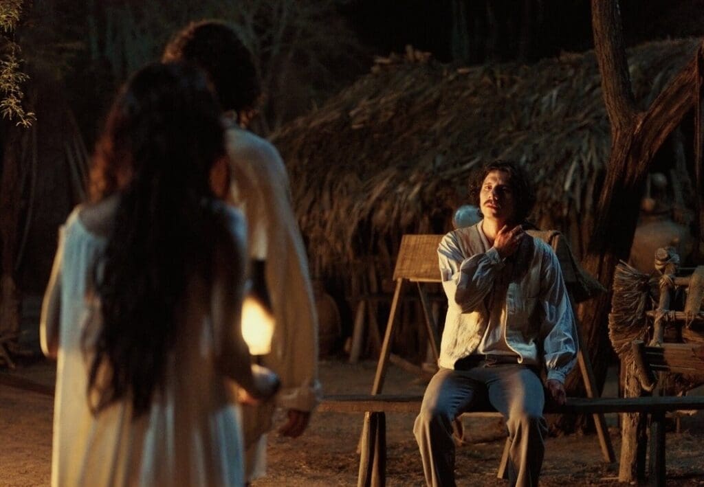 Diễn viên (ngồi) đóng vai một bóng ma của một thanh niên đã bị nhân vật chính José Arcadio Buendía đâm lao vào cổ chết vì đã chế nhạo Buendía lấy vợ nhưng không được vợ cho động phòng. Nguyên nhân là vì Ursula Iguarán vốn có liên hệ họ hàng với chồng, và đã được bà mẹ báo là vì liên hệ đó, nếu họ có con thì đứa con sẽ có cái đuôi heo; do đấy chị không cho chồng làm tình. “Bóng ma” hiện ra không nói không rằng, chỉ nhìn hai vợ chồng kẻ giết mình trong khi dùng tay cố gắng bụm chỗ bị lao đâm để ngăn máu chảy. Vì sự xuất hiện thường xuyên của “bóng ma” này mà hai vợ chồng quyết định khăn gói bỏ làng ra đi cùng với một số thân nhân và bạn bè tìm đường ra biển. Không tìm ra biển, họ dừng lại trong một vùng đầm lầy, và dựng nên làng Macondo. (Ảnh Netflix)