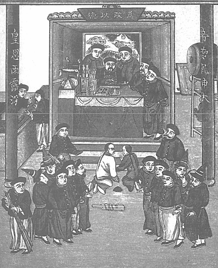 Một con đường khác có thể là thông qua các tuyển tập án lệ như Hình án hối lãm (nguồn gốc của các vụ án), tập trung vào các phần liên quan cụ thể đến bộ máy của hệ thống tư pháp. Ví dụ, chúng ta tìm thấy trong một trong những vụ án được kể khá sống động về việc áp lực của đám đông hỗn loạn tại pháp trường dẫn đến việc chặt đầu nhầm một tội phạm đáng lẽ phải bị thắt cổ và thắt cổ nhầm một người khác đáng lẽ phải bị chặt đầu.