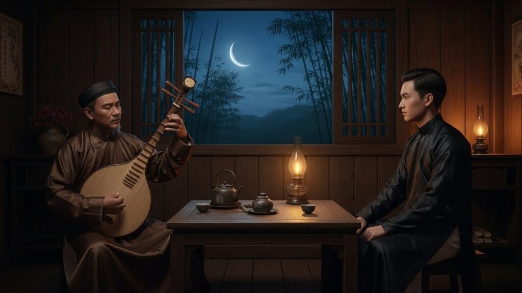 Câu nói rơi xuống nền gạch lạnh như hòn sỏi rơi vào lòng giếng cạn. Đêm đó, ông ngồi một mình bên cây đàn nguyệt, không bật đèn, chỉ có ánh trăng lẻ loi đâm nghiêng qua song cửa. Ông gảy đi gảy lại bản Bình Sa Lạc Nhạn. Tiếng đàn chập chờn như hơi thở hụt hẫng. Không phải để diễn tấu, mà như để dỗ lòng mình.