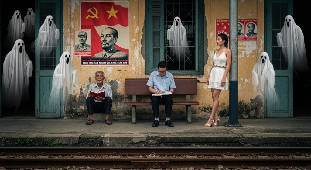 Sân ga xép hoang tàn. Cận cảnh là đường ray cũ kỹ, rỉ sét. Bức tường loang lổ. Trên tường là những tờ khẩu hiệu rách, không đủ câu, sót lại vài chữ lớn Tiến Lên…, Hoan Hô…
