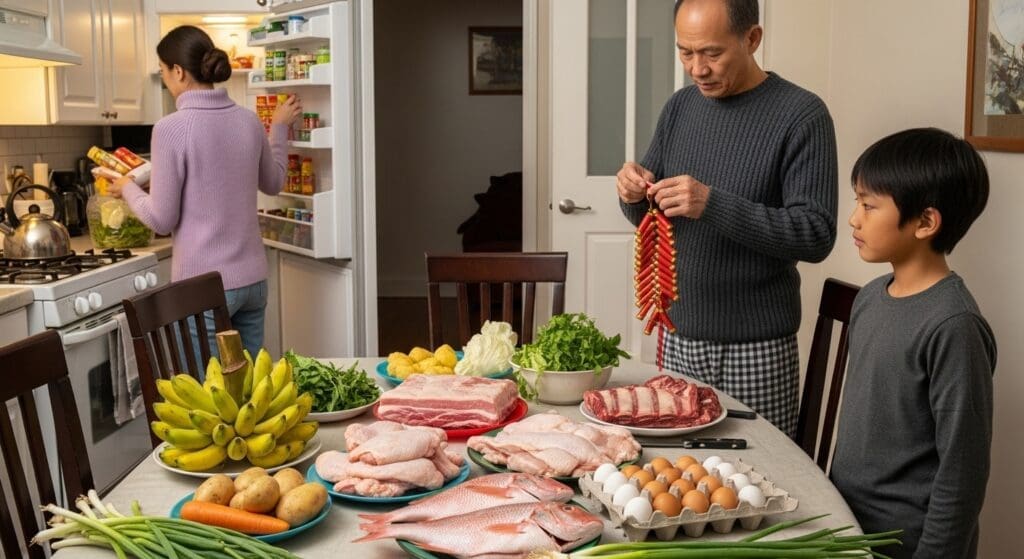 Chị mở cốp xe. Lấy ra một cái hộp khá lớn, chẳng biết đựng gì trong đó, một bó hoa, một bịch cam, hai nải chuối giống như chuối cau ở Việt Nam, chứ không phải chuối trái lớn và dài thường thấy. Rồi miếng thịt heo ba chỉ khá to, mấy cái đùi gà đã làm sạch lông, hai con cá diêu hồng, khúc sườn bò, vỉ trứng gà. Tiếp theo là khoai tây, cà rốt, hành củ, hành lá, và đặc biệt rau thơm đủ loại.