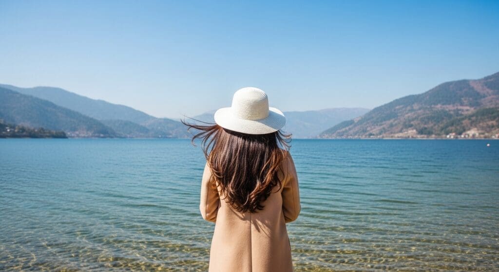 Tôi đi theo tấm giấy chỉ đường của bà Sue, vòng vèo qua những con đường vắng vẻ cô đơn, trườn lên tuột xuống nhiều con dốc thì tới đuọc hồ.  Tôi bước ra khỏi xe bần thần nhìn xung quanh.  Không bóng người lai vãng.  Hoang vu đến rợn người.  Chỉ có tôi, đối diện là cái hồ và linh hồn của cha tôi thì đang lẩn khuất ở đâu đó. Hồ rộng bao la, được che chắn bởi những dãy núi, nước trong vắt và phẳng phiu như tấm gương lớn đang ngửa mặt lên trời hứng muôn ngàn tia nắng quay cuồng nhảy nhót.  Gió phần phật như muốn thổi bay cái nón của tôi và luôn cả tôi nữa.  Tôi đi lần xuống mé nước đưa bàn chân khỏa nhẹ trên làn nước lạnh ngắt.  Những lượn sóng mơn man vỗ về da thịt tôi.  Tôi nghe tiếng thở dài của chính mình:”  Không biết cha nằm đâu dưới đáy hồ này?”  Có một chiếc xe tuần tra của nhân viên bảo vệ chạy chầm chậm trên con đường dẫn xuống hồ.  Thấy tôi người nhân viên ló đầu ra đưa tay chào rồi lái xe đi mất.
