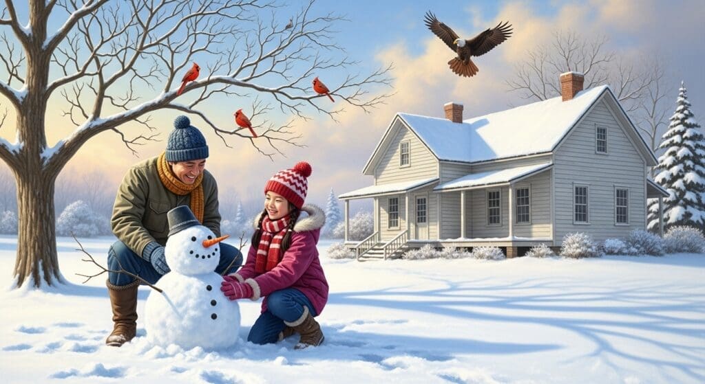 Chẳng mấy chốc là trời sang Đông, tuyết bắt đầu rơi, những bông tuyết đầu mùa bay bay trong hư không rất đẹp, rất nên thơ. Những bầy chim di cư muộn màng cuối cùng rồi cũng đồng loạt bay về phương nam. Trời càng ngày càng lạnh dần thêm, tuyết ngày một nhiều hơn, có hôm tuyết đổ suốt đêm, sáng ra mặt đất trắng tinh khôi như một khung trời mới lạ vừa xuất hiện, cũng có khi cứ ngỡ mây trắng từ trên cao phủ mặt đất này. Họ nhà chim cũng có những loài không sợ rét bao giờ, tiêu biểu như bọn chim cardinal (chim hồng y). Chúng bất chấp giá rét, tuyết băng trắng càng làm nổi bật sắc lông của chúng, cái màu lông đỏ pha cam và viền đen quanh đầu. Những con chim cardinal nhảy tí tách trên cành tìm những trái cây dại còn sót, chúng cũng xúm lại quanh những cái lồng treo thức ăn mà con người biếu tặng chúng.