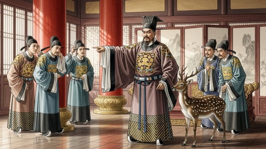 Triệu Cao dắt một con hươu vào triều, gọi đó là ngựa, rồi hỏi quần thần. Câu hỏi ấy không nhằm tìm kiếm câu trả lời đúng. Nó là một phép thử chính trị. Người nào nói sự thật – rằng đó là hươu – bị giết. Người im lặng được ghi nhớ. Người thuận theo quyền lực, lặp lại lời nói dối, thì được bảo toàn và thăng tiến. Từ khoảnh khắc đó, triều đình nhà Tần không còn là nơi bàn quốc sự, mà trở thành một không gian của sự đồng lõa tập thể.